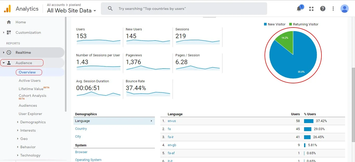 از بخش audience وارد گزینه overview شوید. کمی صفحه را به پایین اسکرول کنید تا با این بخش (تصویر بالا) روبرو شوید. نمودار دایرهای که در عکس مشخص شده، به شما نشان میدهد که چند درصد از کاربرانتان برای بار اول به سایت وارد میشوند و چند درصدشان کاربران بازگشتی هستند. (یادتان باشد که اهمیت کاربران بازگشتی برای سئو سایت شما خیلی زیاد است!)