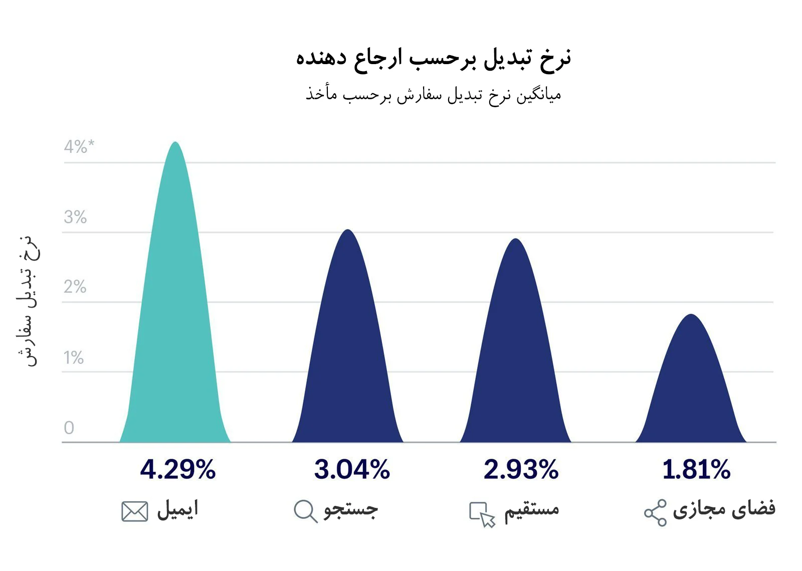 طبق یک تحقیق توسط وبسایت shopify، در مقایسه با سایر روشها، ایمیل با 4.29% بالاترین نرخ تبدیل مخاطب به مشتری را دارد و در پله بعد از آن، جستجوی اینترنتی قرار دارد.
