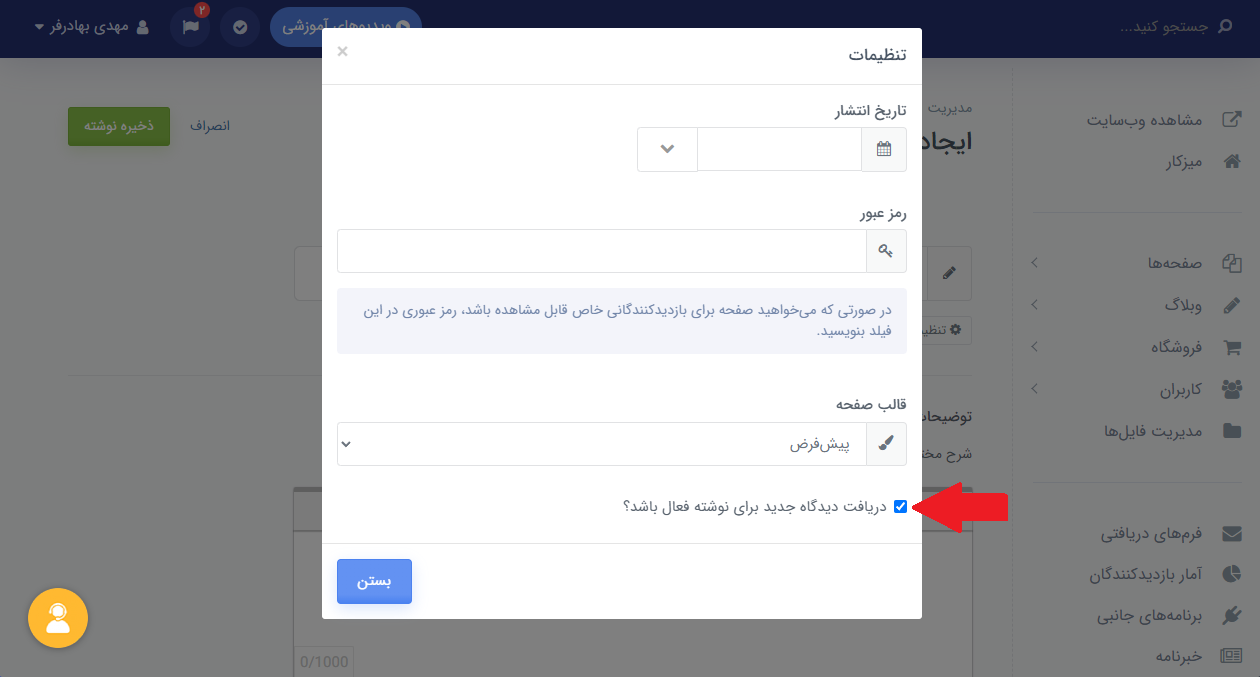 افراد مختلفی که از محتوا و مقالات سایت شما دیدن میکنند، در صورت تمایل میتوانند نظرشان در مورد آن مطلب را در همان نوشته ارسال کنند. در انتهای هر نوشته، بخش دیدگاهها وجود دارد. شما میتوانید قابلیت درج دیدگاه را برای نوشتههای موردنظرتان غیرفعال کنید. برای این کار باید موقع ایجاد نوشته یا ویرایش آن، روی دکمۀ "تنظیمات" کلیک کنید. سپس از پنجرۀ باز شده، تیک گزینۀ "دریافت دیدگاه جدید برای نوشته فعال باشد؟" را بردارید.