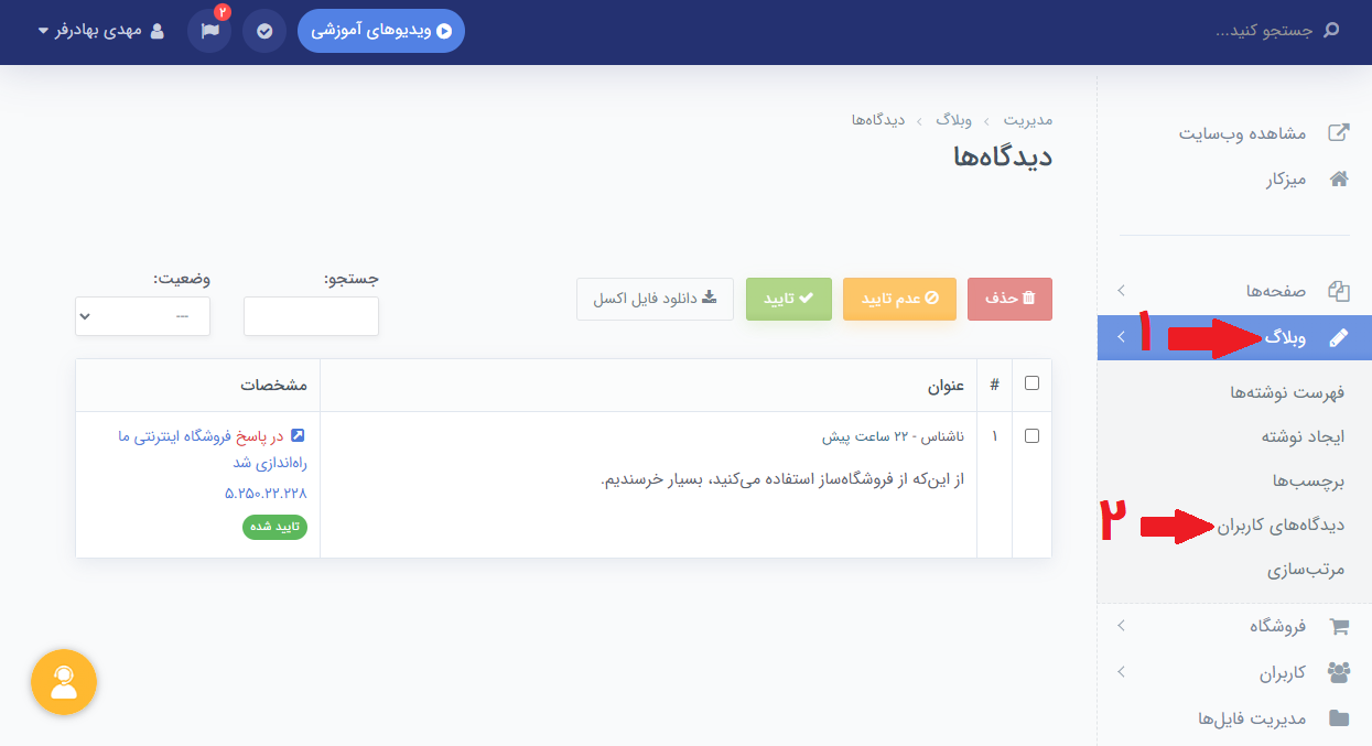 برای مشاهده دیدگاههایی که افراد مختلف در نوشتههای شما ارسال کردهاند، ابتدا از منوی سمت راست پنل مدیریت سایتتان روی گزینه وبلاگ کلیک کنید. در ادامه از بین گزینههای باز شده، روی دیدگاههای کاربران کلیک کنید.