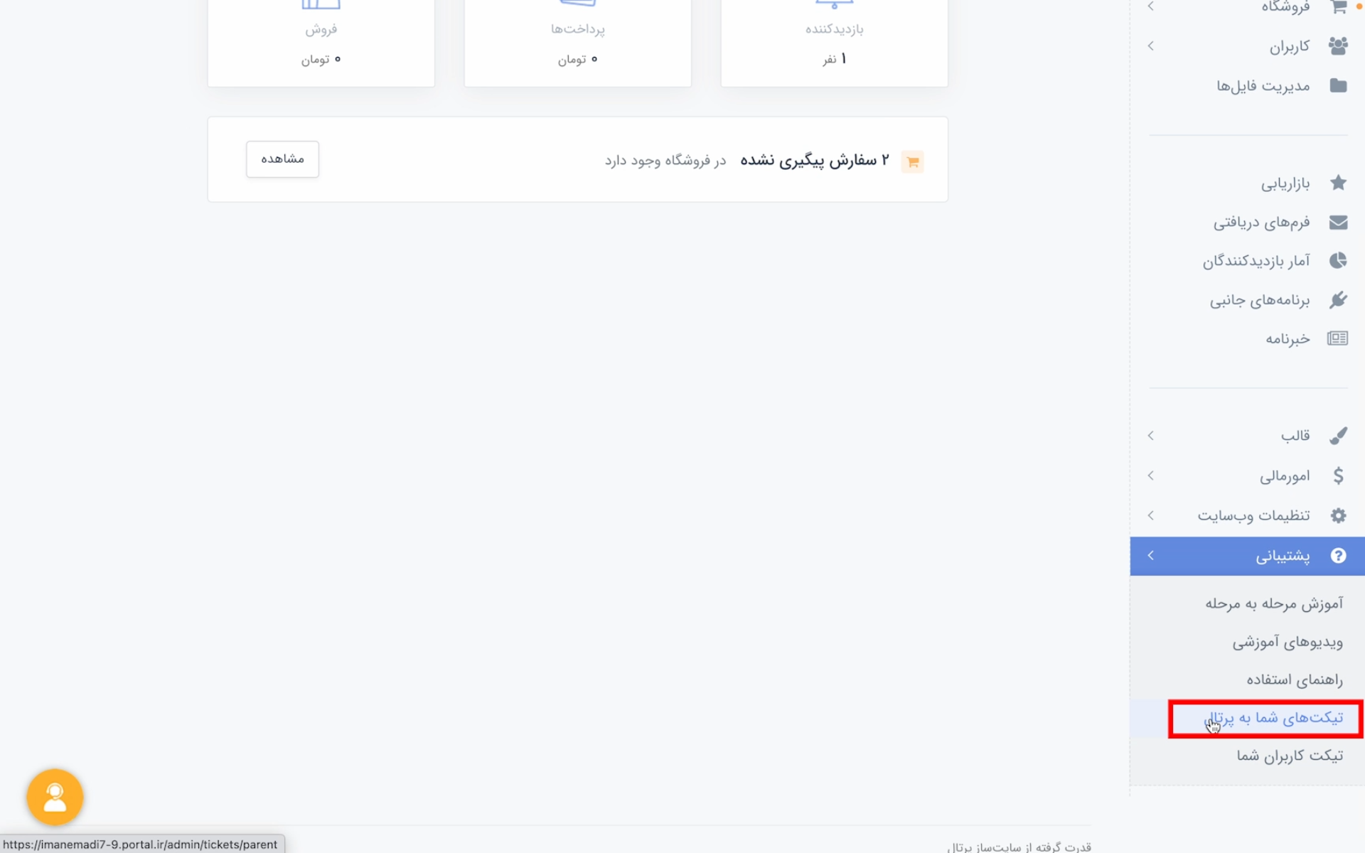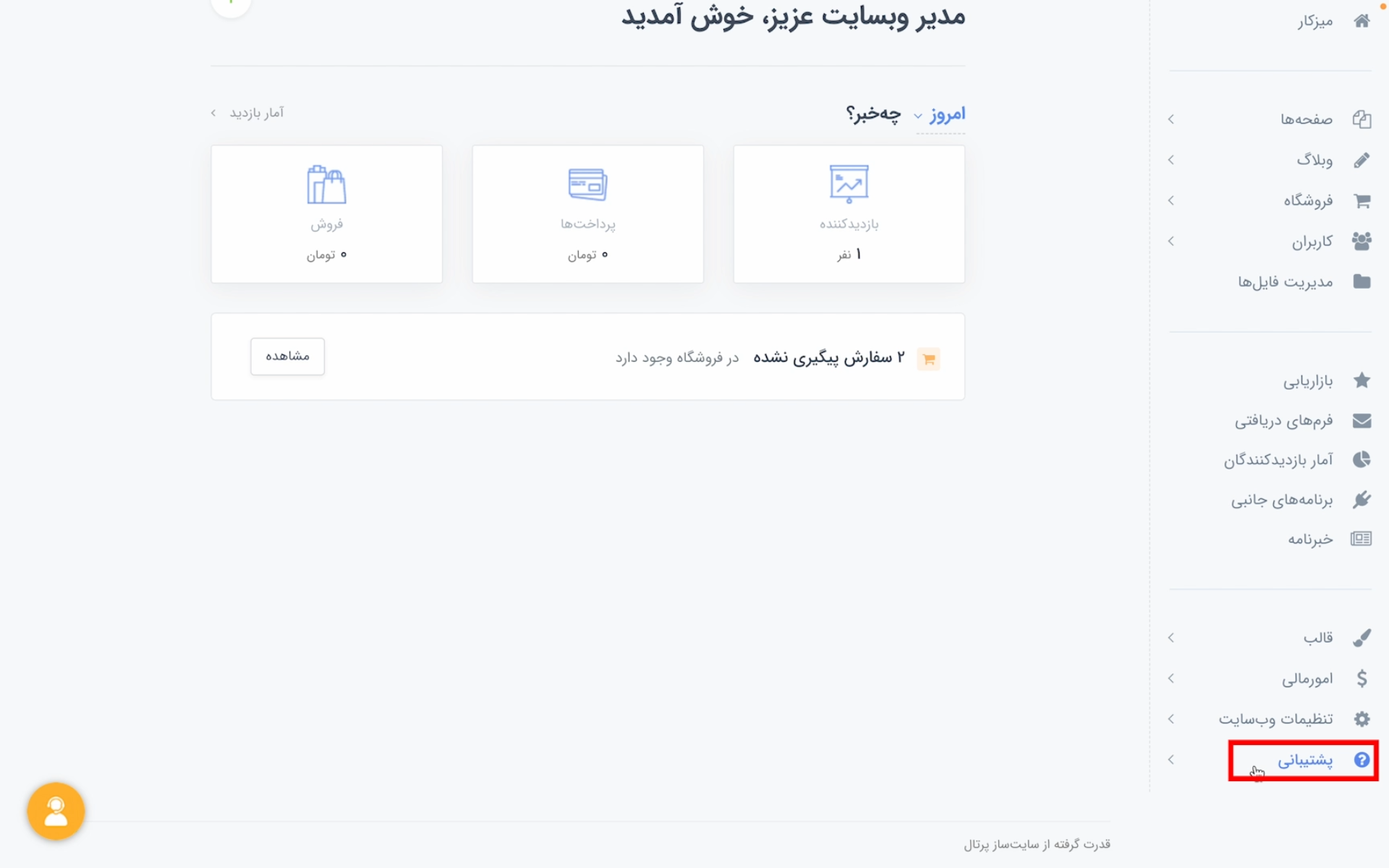 اگر بخش اینماد در قالبی که انتخاب کردید وجود نداشت، به پنل مدیریت سایت بروید. از منوی سمت راست روی «پشتیبانی» کلیک کنید.
