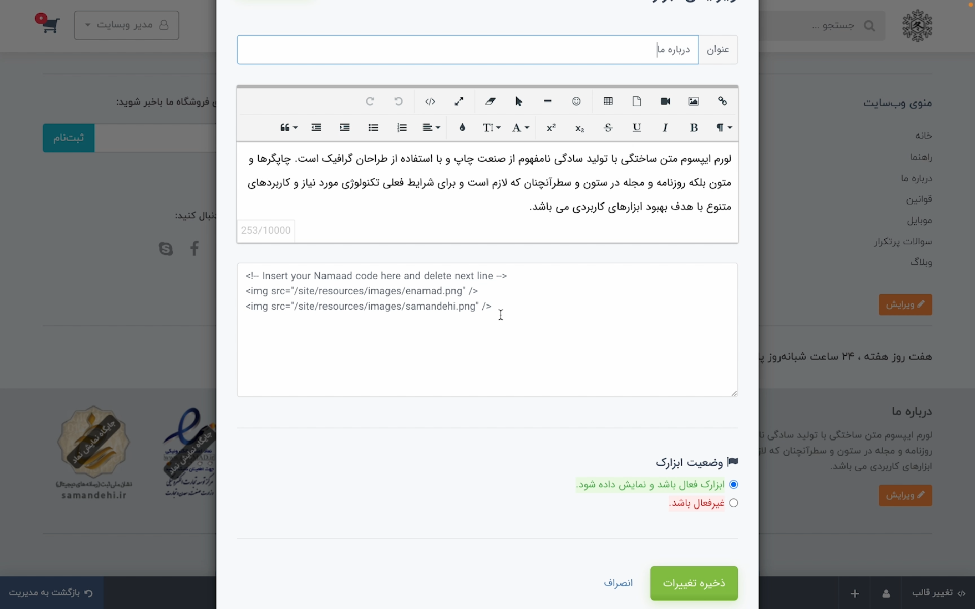 حالا فقط کافیست کدی که اینماد به شما داده است را کپی کنید. در بخش ویرایش ابزارک قسمتی که باید کد اینماد را قرار دهید، مشخص شده است. ابتدا کدهایی که در این کادر قرار دارد را به صورت کامل پاک کنید. بعد از آن کد اینماد را در این بخش قرار دهید. در انتها هم روی دکمه «ذخیره تغییرات» کلیک کنید.