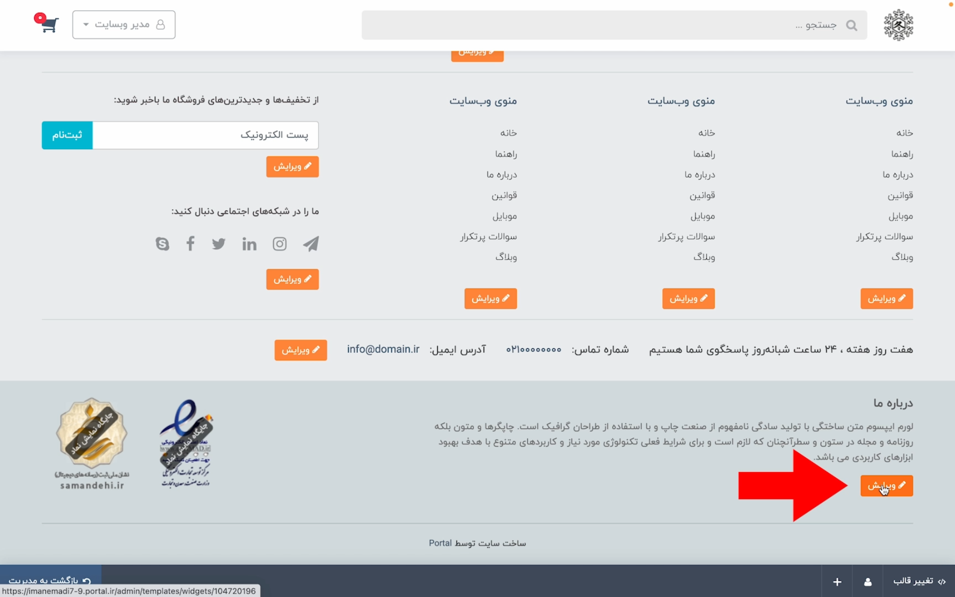 در ادامه به قسمت پایین سایت بروید تا بخشی که نماد اعتماد در آنجا قرار میگیرد را مشاهده کنید. در کنار این قسمت روی دکمه «ویرایش» کلیک کنید تا بتوانید این بخش را تغییر دهید.
