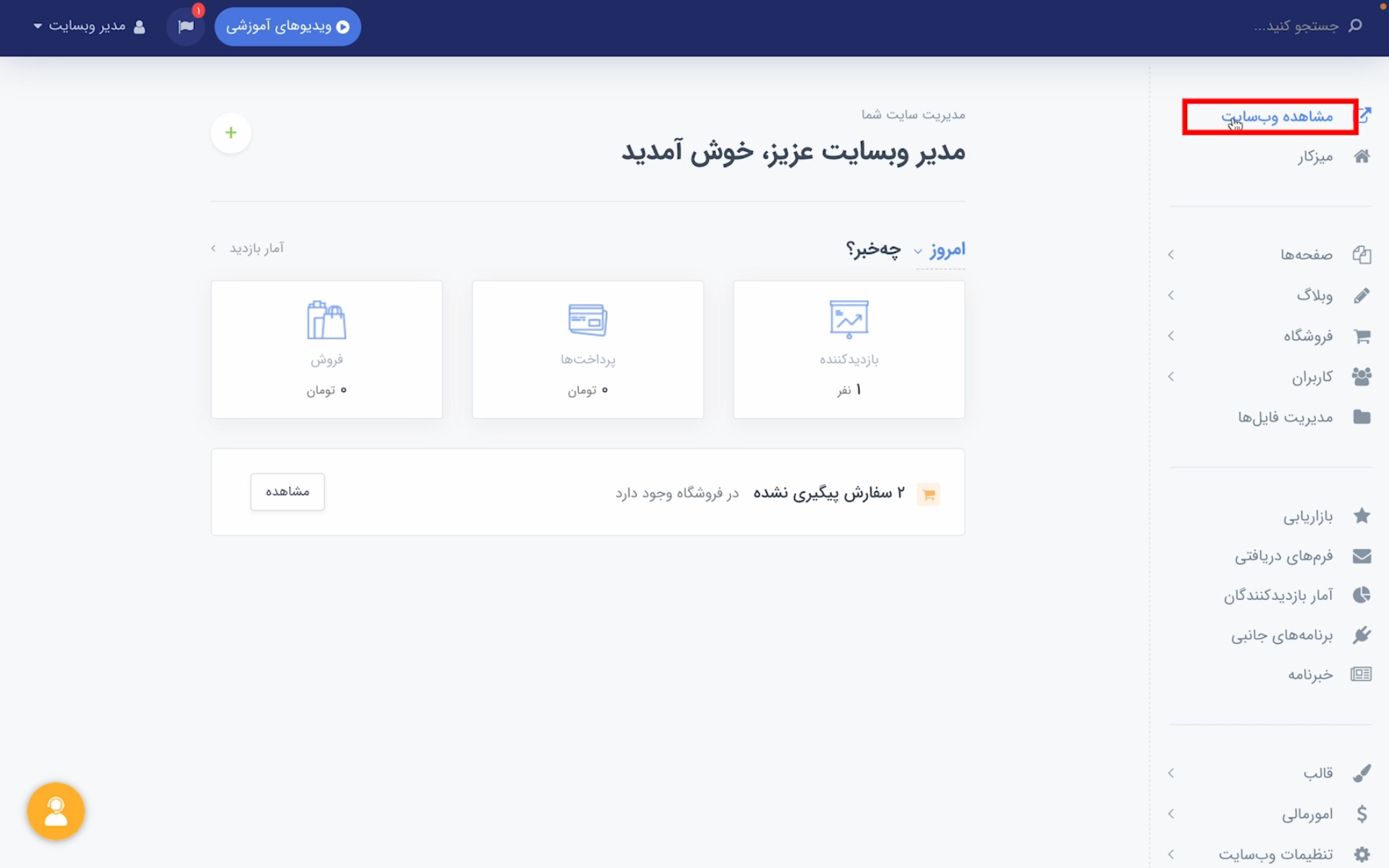 اگر عکس نماد اعتماد در پایین قالبی که برای سایتتان انتخاب کردید وجود دارد، این مراحل را دنبال کنید. در ابتدا باید وارد بخش ویرایش قسمت کد اینماد شوید. برای این کار ابتدا روی گزینه «مشاهده وبسایت» از منوی سمت راست سایت کلیک کنید تا سایتتان را ببینید.