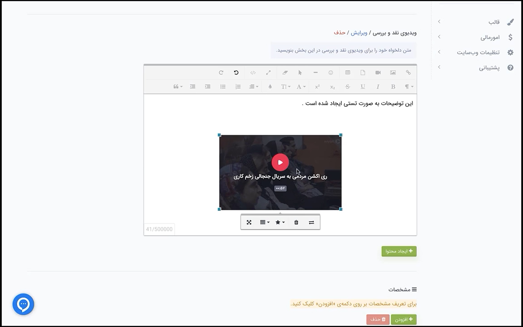 این امکان وجود دارد که قبل یا بعد از ویدیو متن و حتی عکس قرار دهید. در نهایت وقتی که ویدیو خودتان را قرار دادید، روی دکمه «ذخیره تغییرات» در پایین صفحه کلیک کنید تا ویدیو و سایر تنظیماتی که انجام دادید در سایت نمایش داده شود.