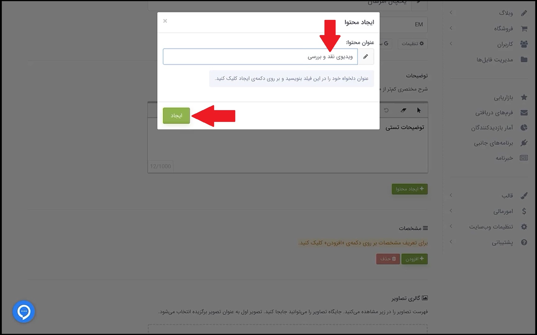 در پنجره جدیدی که برای شما باز میشود، ابتدا عنوان محتوا را داخل کادر مربوطه بنویسید و بعد از آن دکمه «ایجاد» را بزنید تا این بخش ایجاد شود.