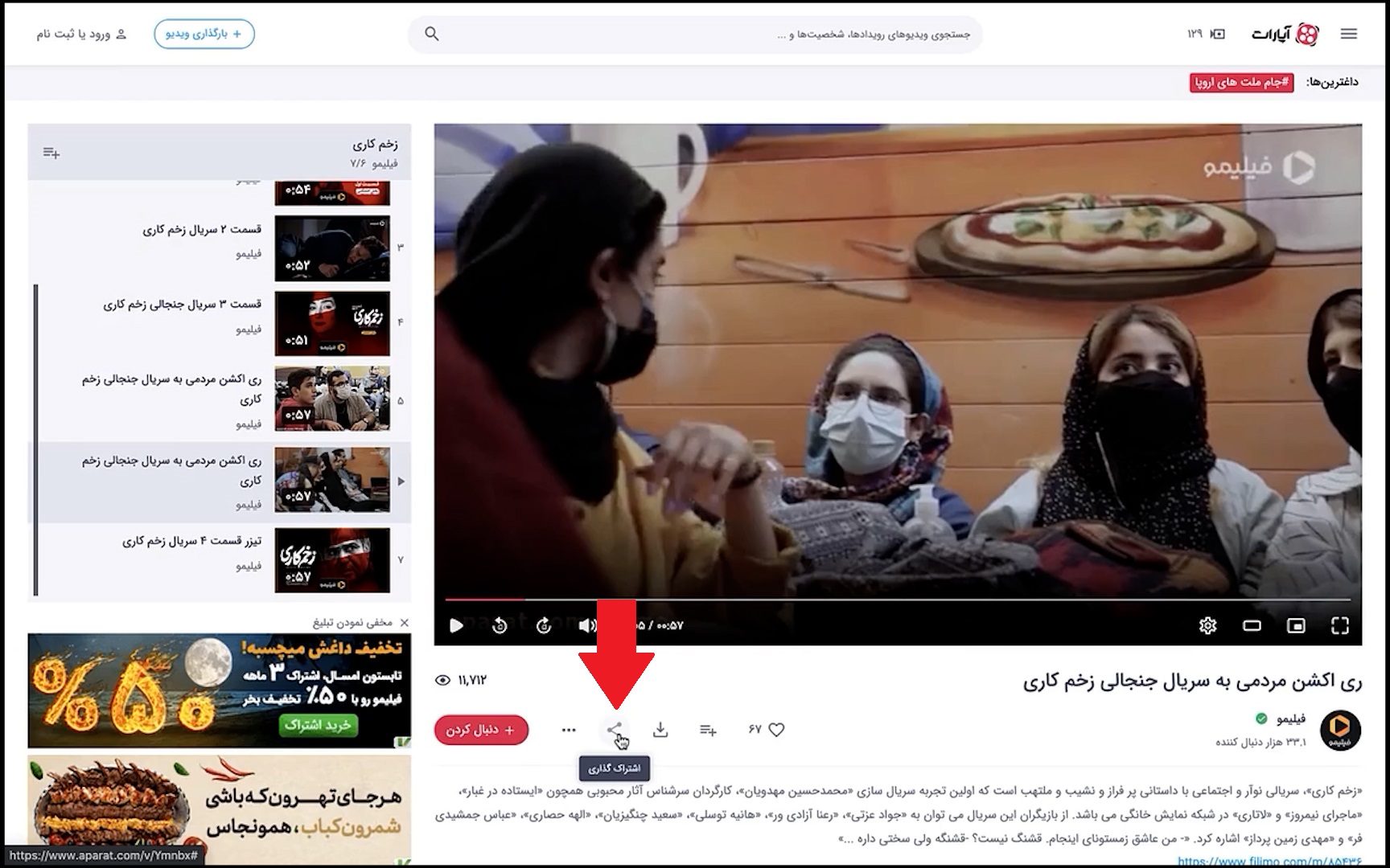 حالا به سایت آپارات بروید و ویدیو خودتان را داخل آپارات آپلود کنید. در صفحه پخش ویدیو در آپارات روی گزینه «اشتراک گذاری» مثل عکس زیر کلیک کنید.