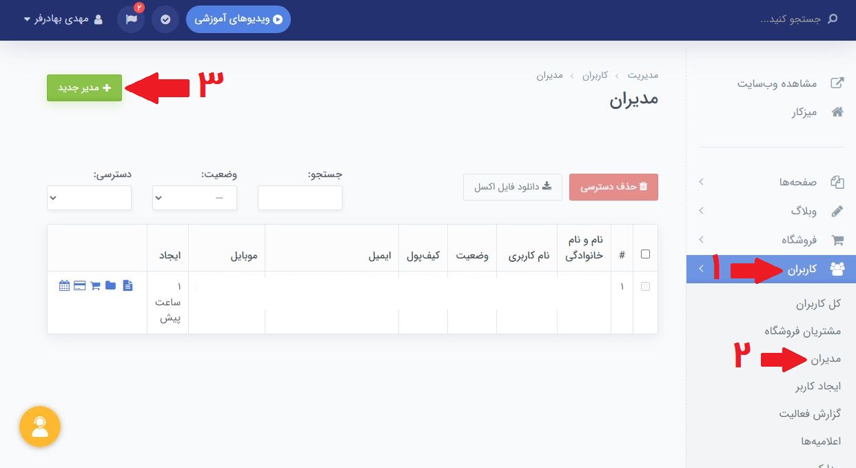 - برای اضافه کردن مدیر جدید، روی دکمۀ "مدیر جدید" در بالای صفحه کلیک کنید.