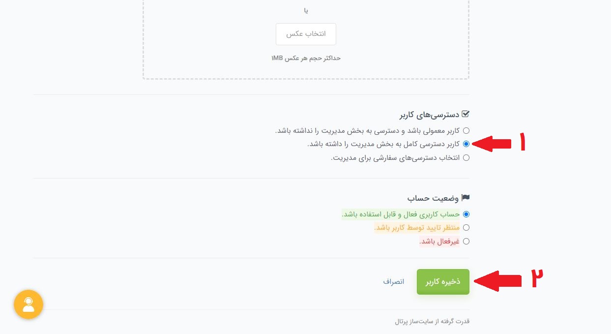 - در بخش "دسترسیهای کاربر" باید یکی از دو گزینۀ "کاربر دسترسی کامل به بخش مدیریت را داشته باشد" یا "انتخاب دسترسیهای سفارشی برای مدیریت" را انتخاب کنید.