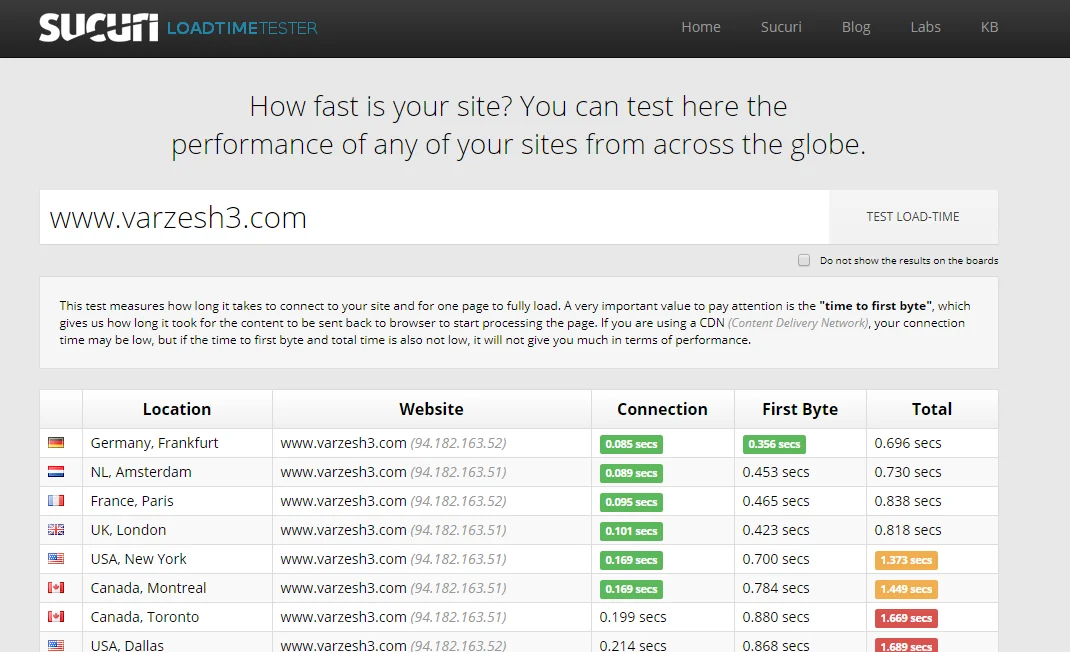 این روش نیز یکی دیگر از روش های تست سریع سرعت سایت می باشد که در واقع عملکرد سرعت سایت شما را در جهان نشان می دهد و نحوه نمره دهی آن از A تا F می باشد. برای دسترسی به این ابزار وارد سایت https://performance.sucuri.net/ شوید.