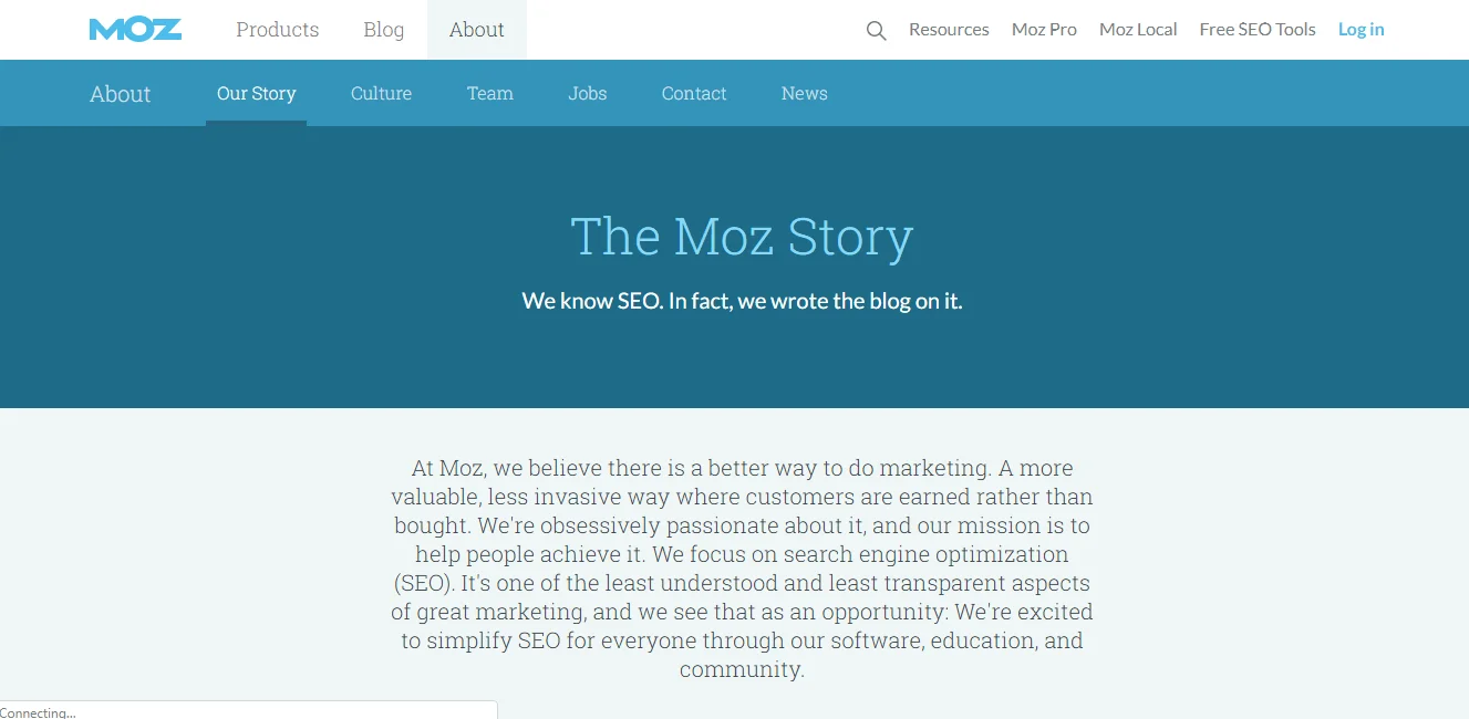 اگر تجربه مدیریت و کار با سایت را داشته باشید، احتمالا MOZ را میشناسید. صفحه درباره ما این سایت، یک نمونۀ موفق است. تاریخچه شرکت از ابتدای تاسیس آن در سال 2004 میلادی تا حال حاضر با ذکر تمامی جزئیات و چالش هایی که اتفاق افتاده است در قالب یک داستان و بهصورت timeline نوشته شده است.