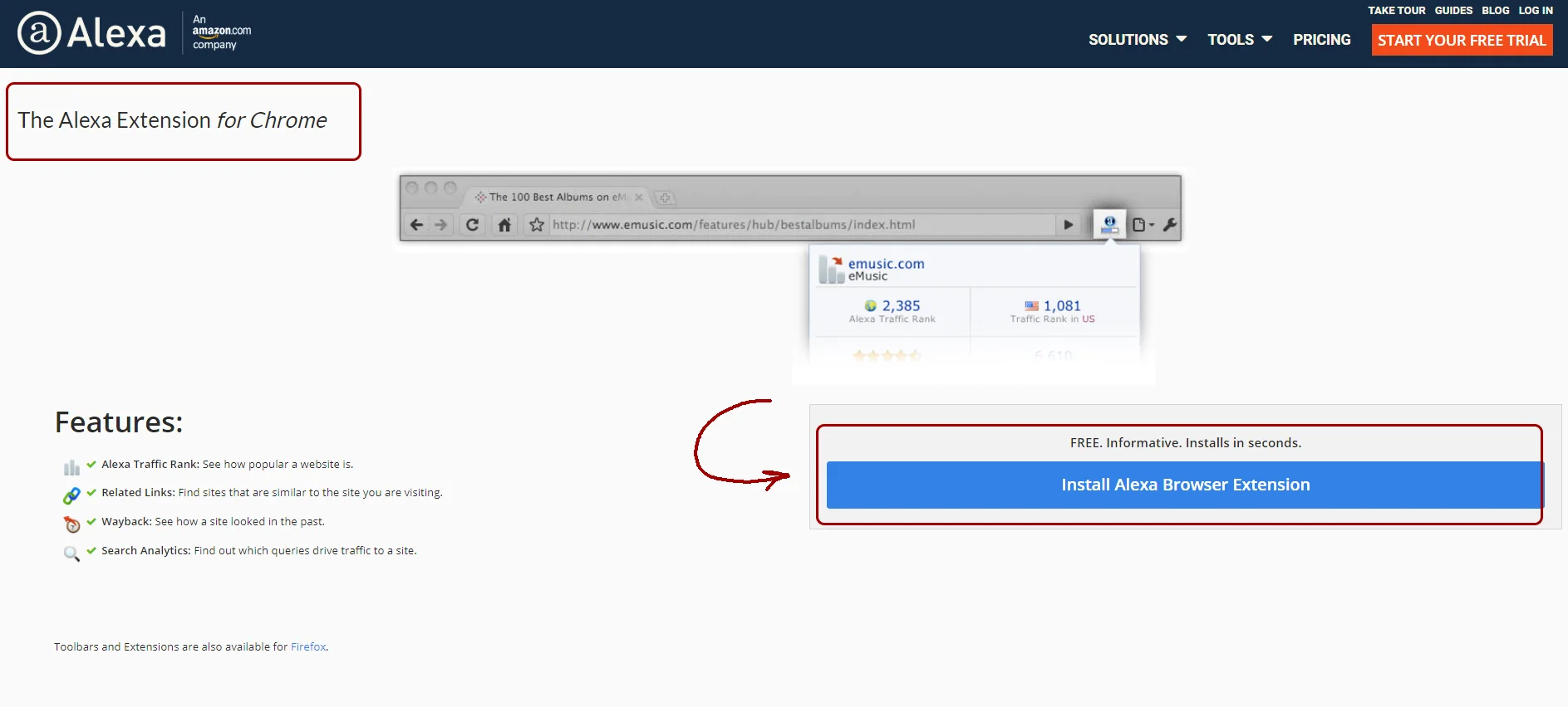 قبل از هر چیز روی وب سایت الکسا ثبت نام کنید و سایتتان را تایید کنید. حالا باید تولبار آن را دانلود و روی مرورگر خود نصب کنید. روی لینک نصب الکسا تولبار کلیک کنید. البته این لینک برای مرورگر گوگل کروم است. اگر از مرورگرهای دیگر مثلا فایرفاکس استفاده می کنید، لینک آن را همان پایین صفحه سایت می بینید.