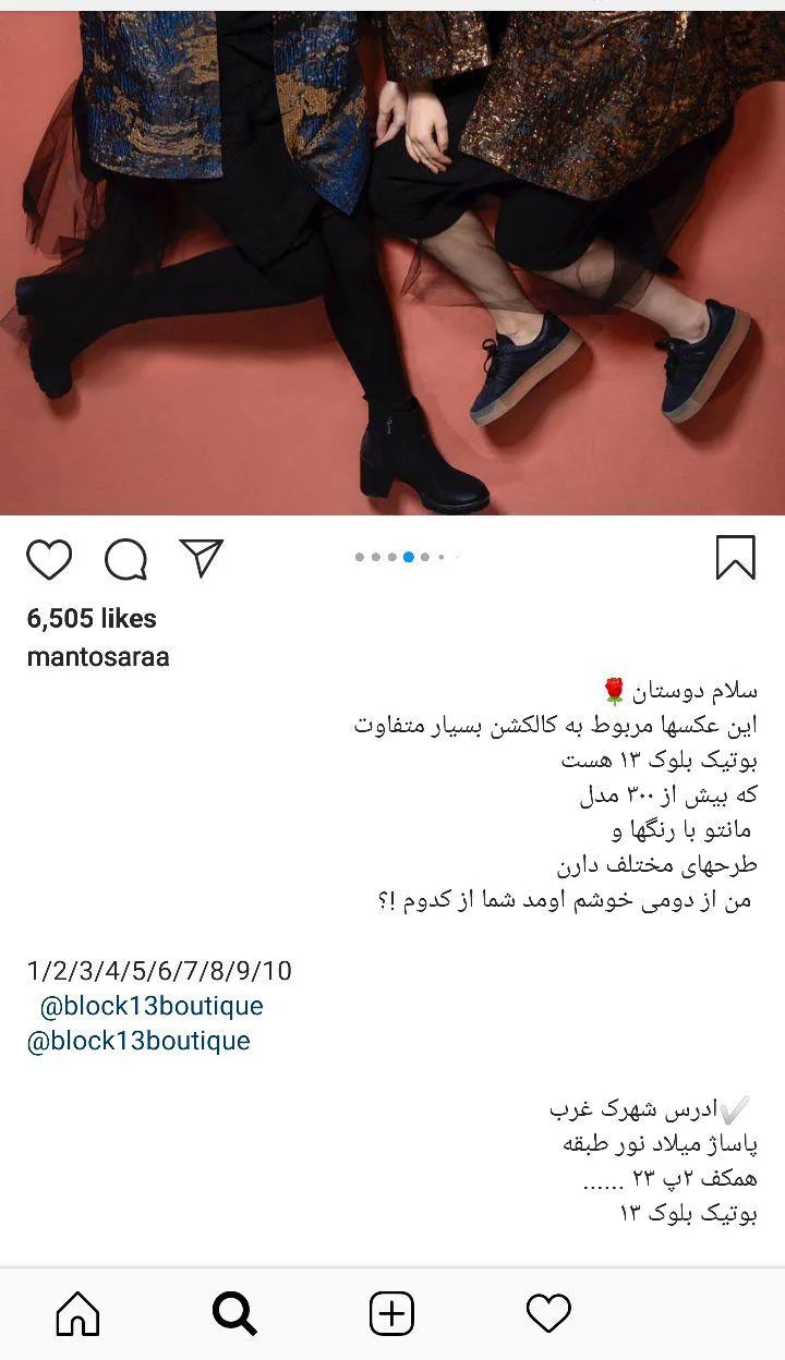 بعد از اینکه اوضاع پیجتان کمی خوب شد، میتوانید آن را برای تبلیغ به دیگران بدهید. مثلا با پرداخت هزینه از پیج هایی که فالوور واقعی بالایی دارند بخواهید تا شما را تبلیغ کنند. این کار به شدت تاثیر مثبت دارد. دو نمونه از این نوع تبلیغات را در تصاویر زیر می بینید. یکی توسط پیج مانتوسرا و دیگری مدوپیا معرفی شده است، که هر دو از صفحات شناخته شده در فشن و مد هستند: